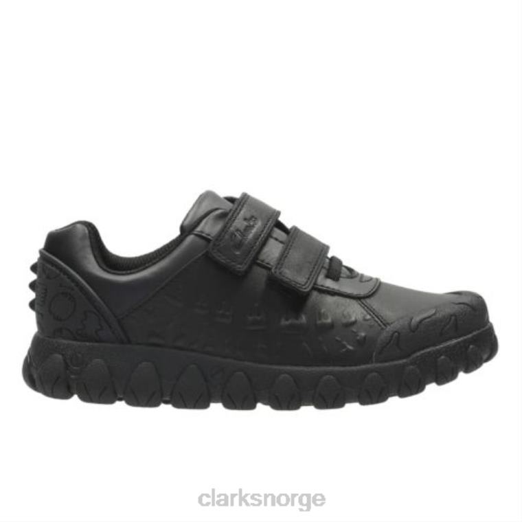 dobbel rip-tape festing. agio-teknologi. fra Clarks populære stompos-serie bruker disse skoleskoene en overdel i svart skinn med dinosaurdetaljer. beskyttende og slitesterk gummisåleenheten med tåbeskytter har tykke klosser for ekstra grep mens klodetaljene på sålen legger til et annet element av moro. med enkel av og på takket være den doble riptape-festingen, har disse skoleskoene også Agion-teknologi for å holde føttene friske hele dagen.