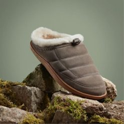 en polstret overdel og justerbar vippe gir trendy tøfler pilton mule en moderne innendørs/utendørs estetikk. premium stein semsket lag med et mykt fôr og slitesterk crepe-effekt gummisåle for varme og godt grep – ideelt for trygge og koselige steg rundt i huset eller når du hopper ut.