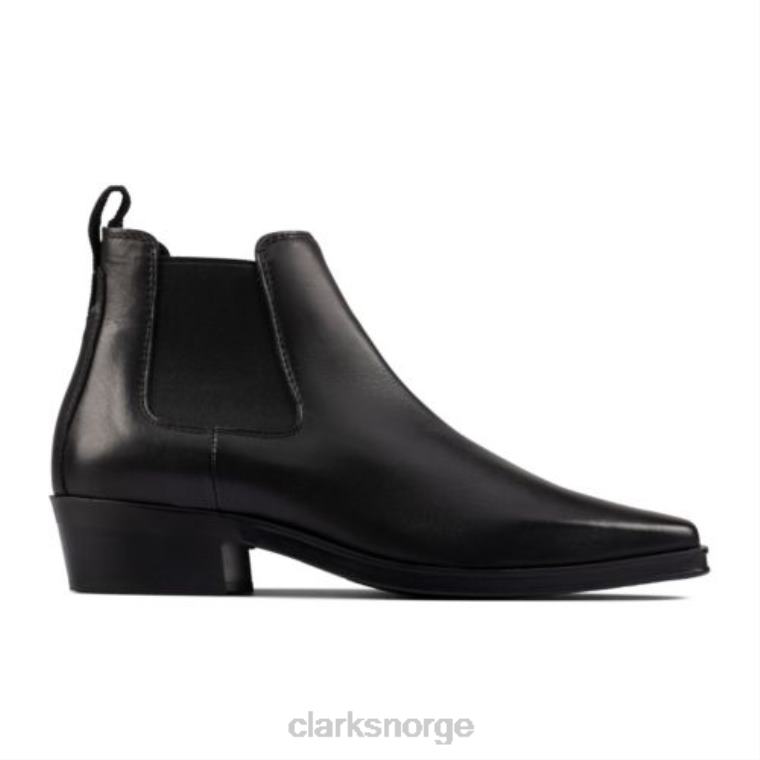 denne ankelstøvelen for kvinner i glatt, svart skinn gjenskaper en klassisk western-inspirert silhuett med elegant spiss tå og legger til elastiske paneler i chelsea bootstil. lett å ta på og allsidig nok til å ha på seg med hva som helst